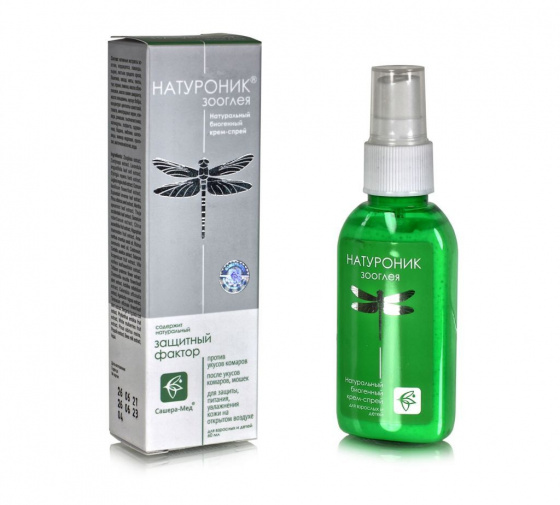 - Крем-спрей против и после укусов комаров «Натуроник Зооглея» - это натуральное гипоаллергенное средство со свойствами репеллента и заживляющего и противовоспалительного продукта. Натуральная формула крема представляет собой комплекс биологически активных веществ с неизмененной молекулярной структурой, проявляющих действие в соответствии с биоритмами человека, не нарушает баланс процессов, происходящих в организме.