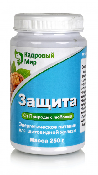 В составе комплекса Защита содержится белок кедрового ореха, стимулирующий синтез гормонов железы, биоорганический йод ядер грецких орехов, пчелиное маточное молочко и экстракт корня лапчатки белой, обладающие сильнейшими восстановительными свойствами.