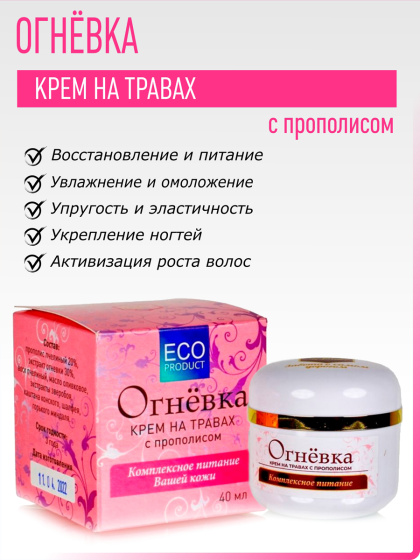 Питательный крем на травах Огнёвка с прополисом состоит исключительно из натуральных компонентов - продукции пчеловодства и фитопрепаратов.