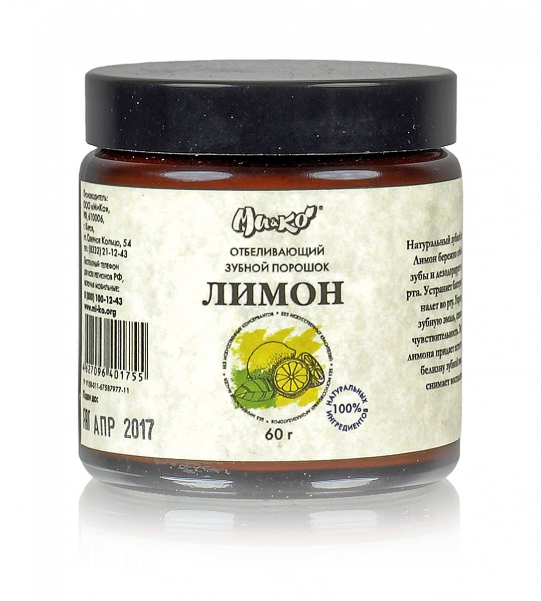 Зубной порошок "Лимон", отбеливающий 60гр. Ми&Ко. Устраняет бактериальный налет, снижает чувствительность