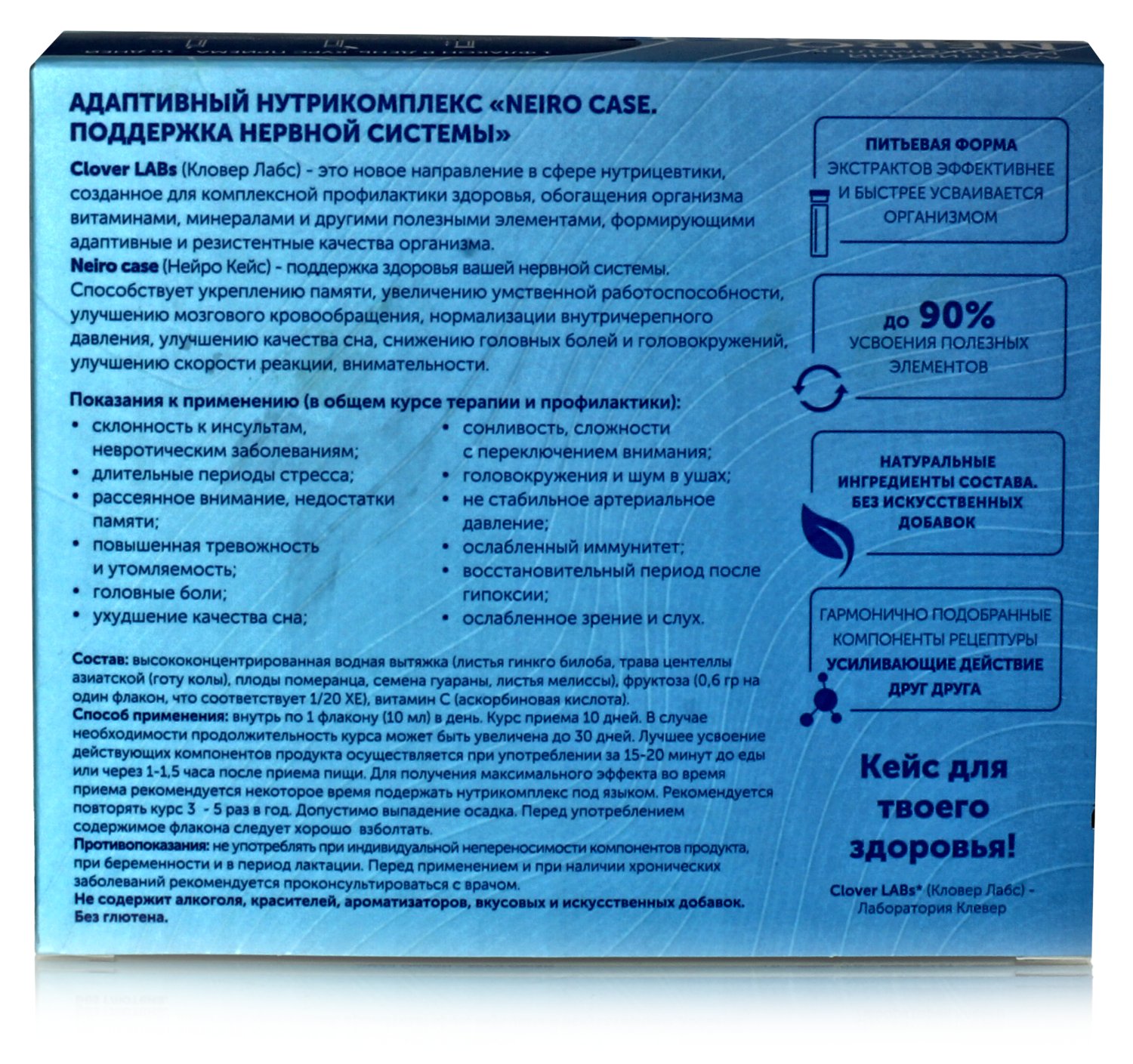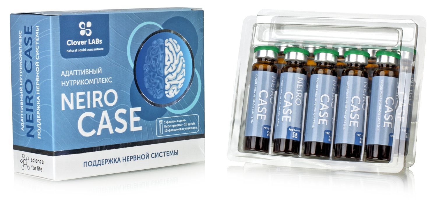 Адаптивный нутрикомплекс "Neiro Case – Поддержка нервной системы" является специализированным природным средством в питьевой форме, разработанным для предупреждения и коррекции различных проблем и нарушений со стороны центральной нервной системы и мозгового кровообращения.
