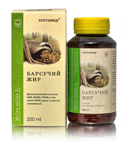 Качественный, правильно вытопленный жир барсука, как правило, представляет собой массу белого или кремового цвета со слабым специфическим запахом. При хранении в холодильнике при температуре +4oC — +6oC градусов барсучий жир имеет густую консистенцию, а при комнатной температуре быстро плавится и становится жидким. В составе барсучьего жира высокий процент содержания полинасыщенных жирных кислот (линолевой и линоленовой), их уникальность состоит в том, что они не синтезируются в организме человека и поступают только с пищей. Они препятствуют образованию холестериновых бляшек и укрепляют стенки сосудов.