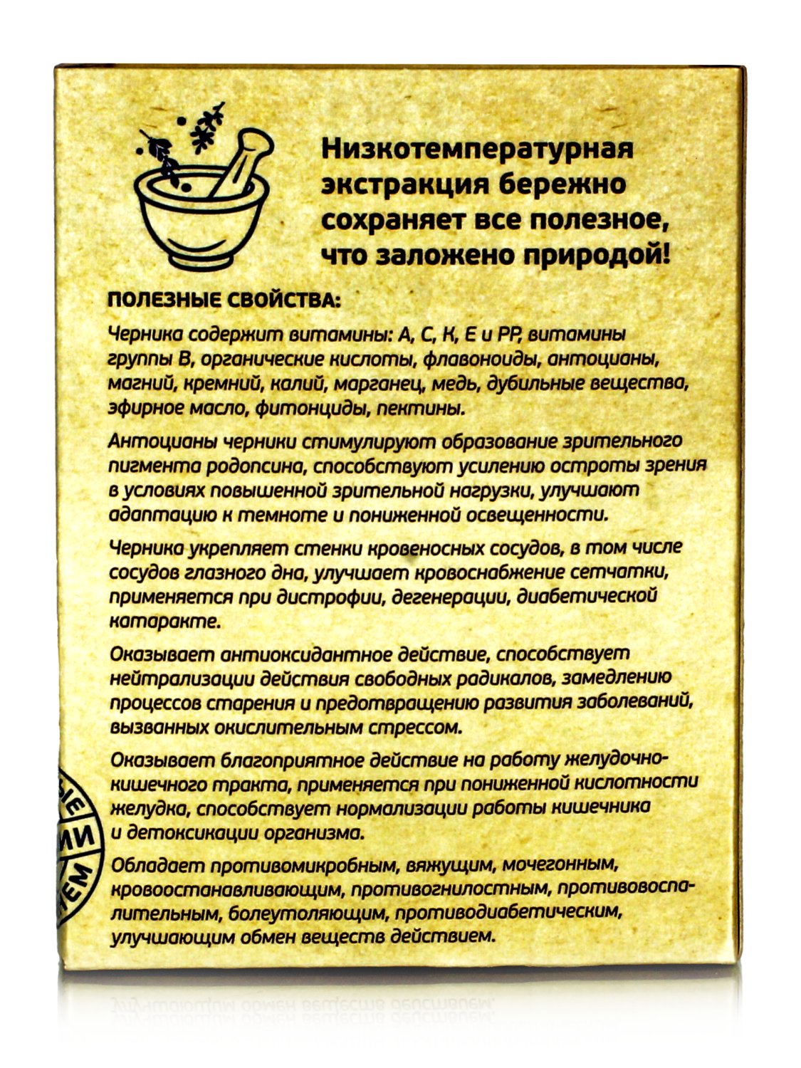Это делает чернику уникальным поливитаминным средством, богатым антиоксидантами, которые нейтрализуют действие свободных радикалов, положительно влияют на укрепление и восстановление тканей, способствуют улучшению кровоснабжения сетчатки глаза.