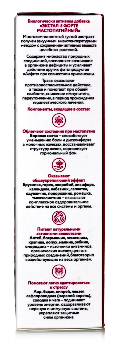 Травы, входящие в состав Экстала - 5 уменьшают боли и неприятные ощущения, способствуют рассасыванию уплотнений в груди, помогают предотвратить онкологические заболевания молочных желез.