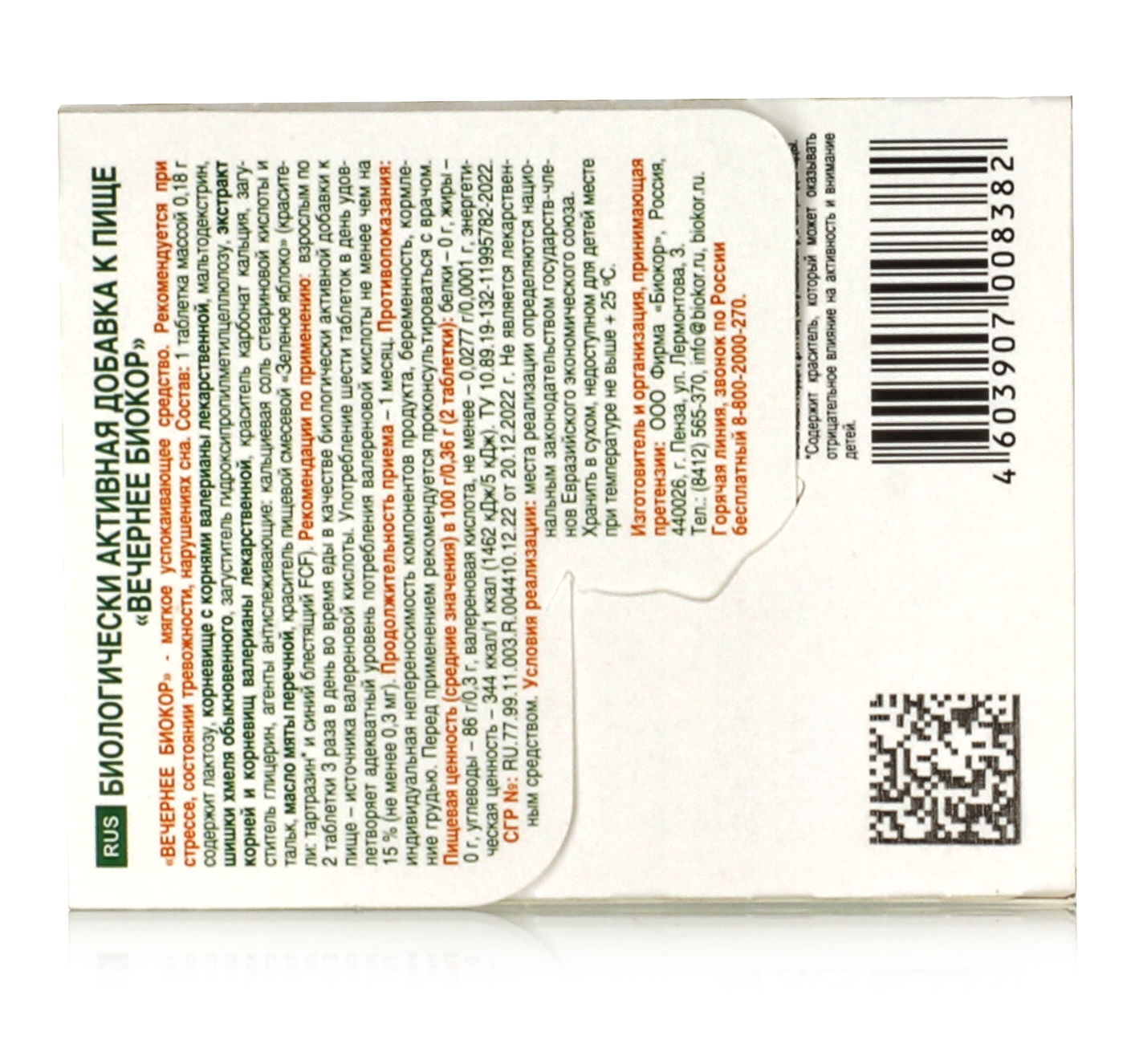 Вечернее «Биокор» – мягкое успокаивающее средство при стрессе, нарушениях сна, состоянии тревожности на основе валерианы, мяты и хмеля.