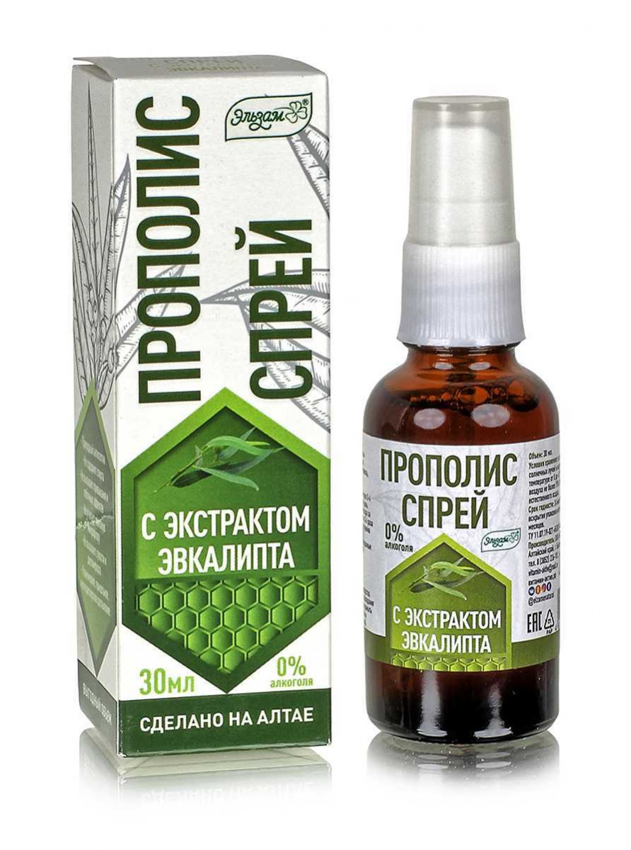 Прополис-спрей имеет противовоспалительные, ранозаживляющие, противовирусные и противомикробные свойства благодаря экстрактам прополиса и эвкалипта: