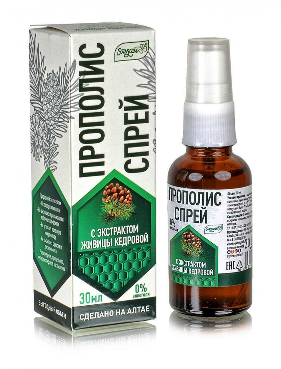 Прополис-спрей с экстрактом живицы кедровой предназначен для профилактики и гигиены в сезон простудных инфекций, при мелких повреждениях кожи. Спрей помогает избавиться от дискомфорта в горле, облегчает течение инфекционно-воспалительных процессов при стоматологических проблемах, способствует быстрому заживлению. Не вызывает жжения и других неприятных ощущений. Может применяться лицами с сахарным диабетом, гипертонией, беременными, водителями и т.д.